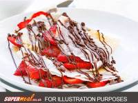 Crepe stuffed with strawberries and cream drizzled with melted white chocolate.